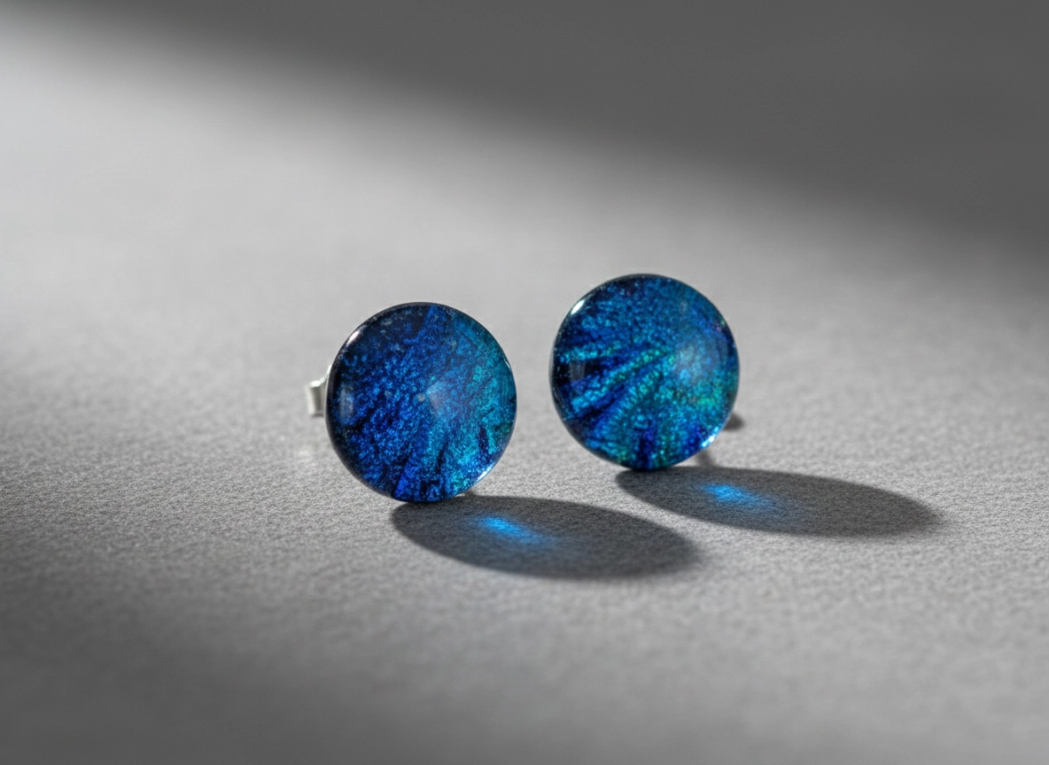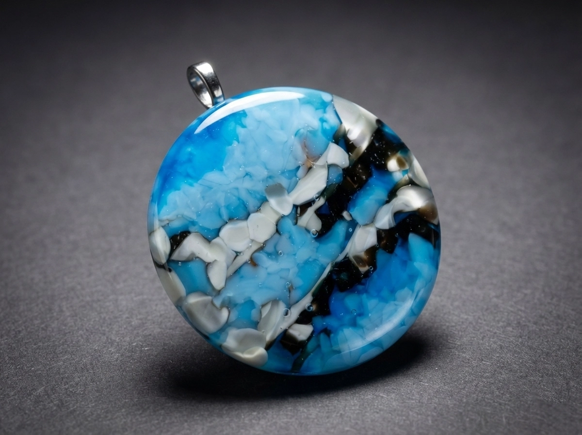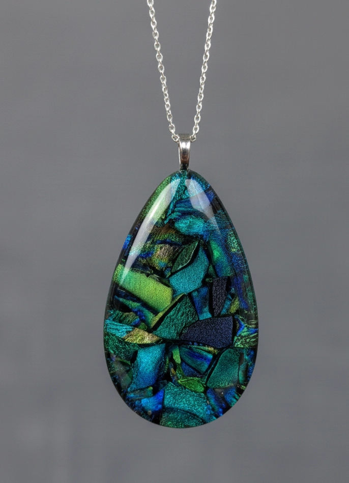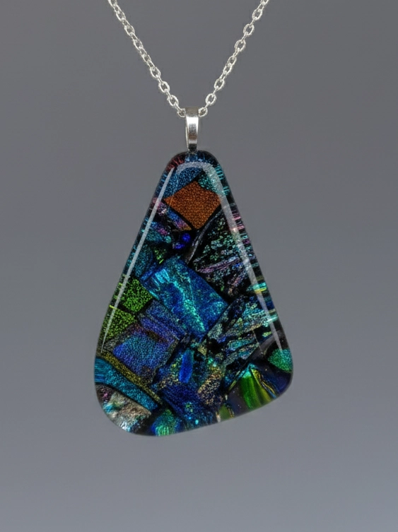 Each piece is individually handcrafted using dichroic fused glass, making every item truly one-of-a-kind.